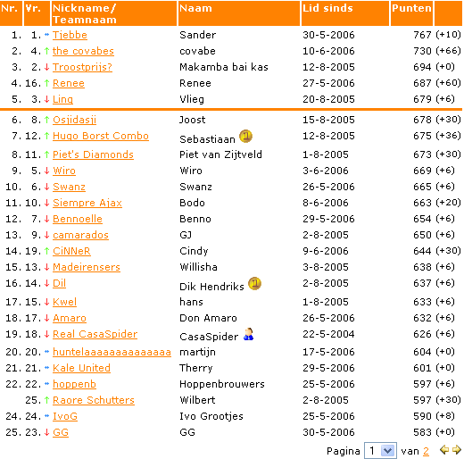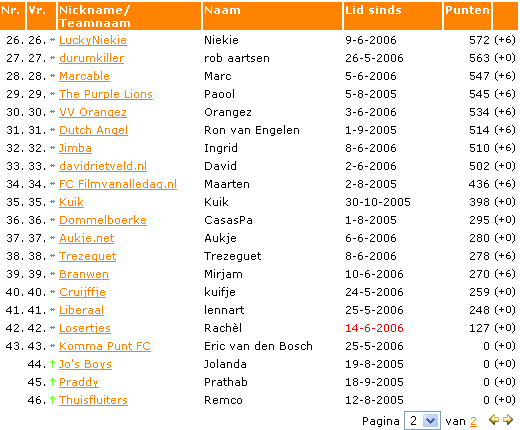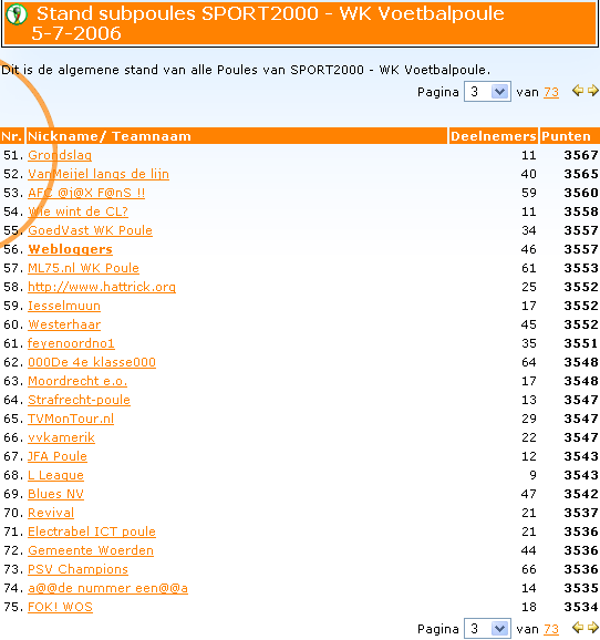 De voetbalpoule loopt ten einde. Veel verandert er niet meer aangezien de meeste mensen het uitgeschakele Brazilie als wereldkampioen hebben getipt. In het algemeen klassement zijn de Webloggers naar de derde pagina verdreven, toch een koude douche. We staan op een gedeelde 55e plaats.