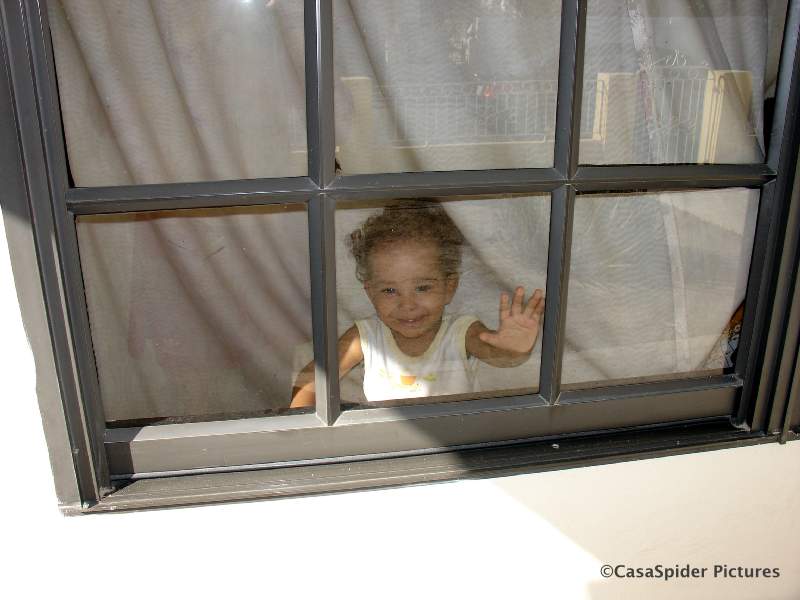 Nu gaat ze staan en slaat van blijdschap met haar hand tegen het raam. Eindelijk kan ze naar buiten kijken. Luchiano (9) is inmiddels omgelopen en kijkt van buitenaf naar binnen. Als ik even later hetzelfde doe is Diana nog steeds zeer in haar nopjes.