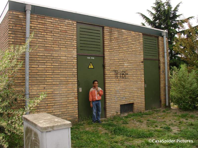 Luchiano (9) poseerde voor het electriciteitshuisje. Vroeger had ik een heilig ontzag voor dat electriciteitshuisje, volgens mijn moeder kwam daar de stroom uit als je door het sleutelgat keek. Ik had geen idee hoe de stroom eruit zag maar stelde mij iets voor van een vlammenzee die recht op mij af zou komen.