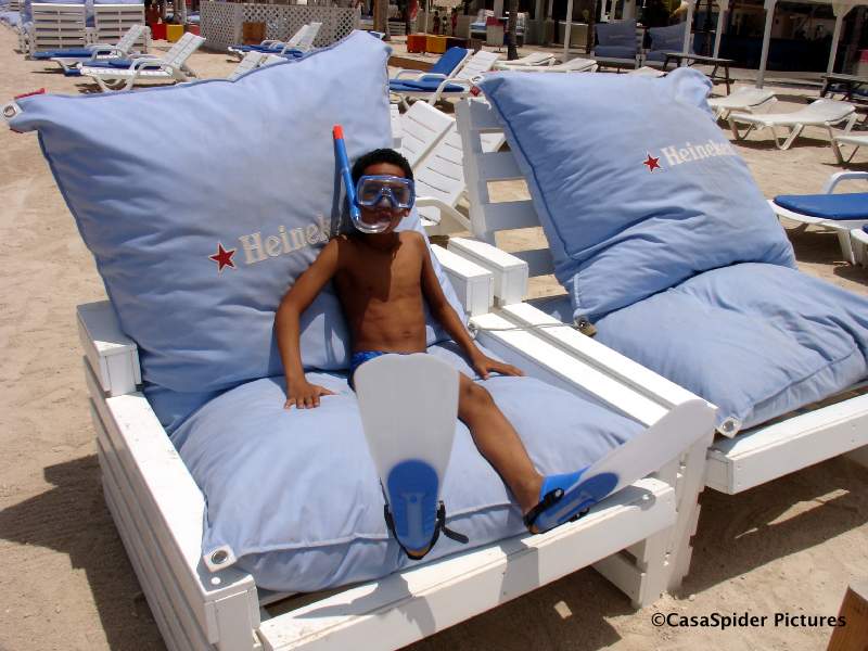 De huidige snorkelset is van betere kwaliteit, het is een verlaat verjaardagskado van CasasPa en Truus dat zij samen met Luchiano in Valkenswaard hebben uitgezocht. Voor de tewaterlating diende er een foto gemaakt te worden op een van die nieuwe vette lounge-stoelen van Mambo Beach. Daarna doken we onder.