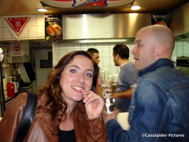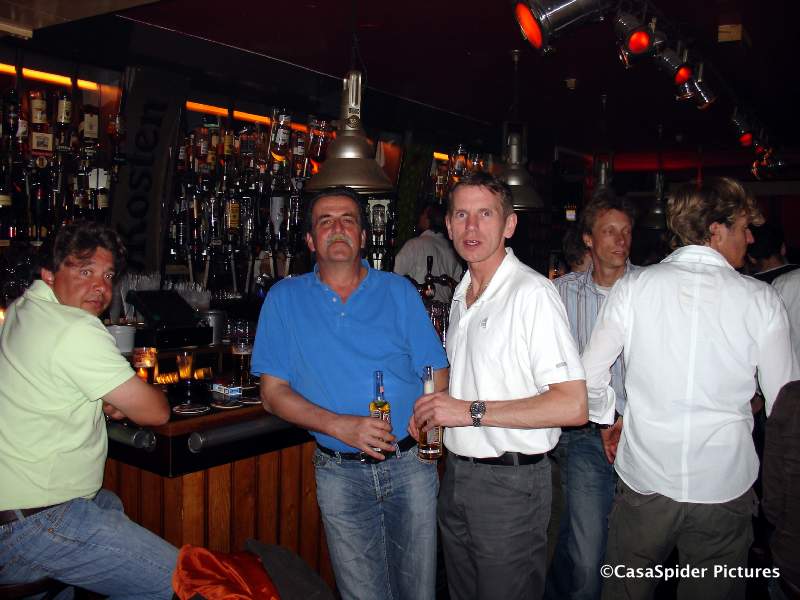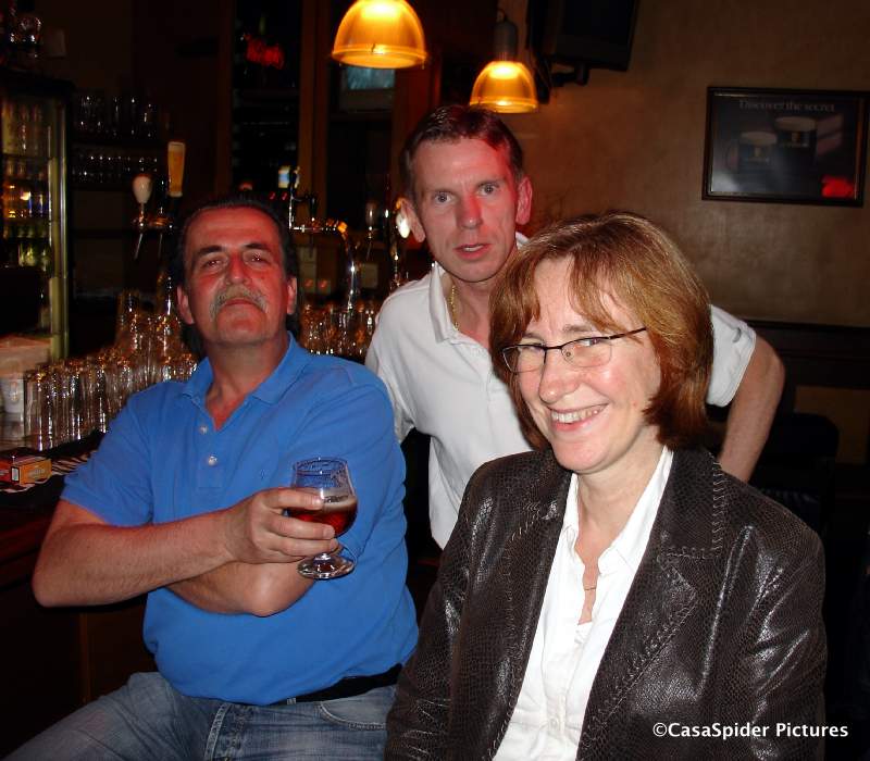 Jannie moest de trein naar Houten halen en haakte als eerste af. Wij liepen naar het Janskerkhof en zaten bij Hofman (klopt dat, Piet?). De tijd vloog om hetgeen een goed teken is. Het meenemen van een fotocamera is vaak een goede zet bij dit soort gelegenheden, immers mensen vinden het leuk om gefotografeerd te worden. Wel moest ik erg vaak en hard schreeuwen dat ik CasaSpider ben, de merkbekendheid is op Curacao kennelijk hoger dan in Utrecht. Nu kon ik mijn naam echter eens op de rug van een vrouw schrijven, op een papiertje wel te verstaan.