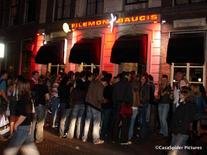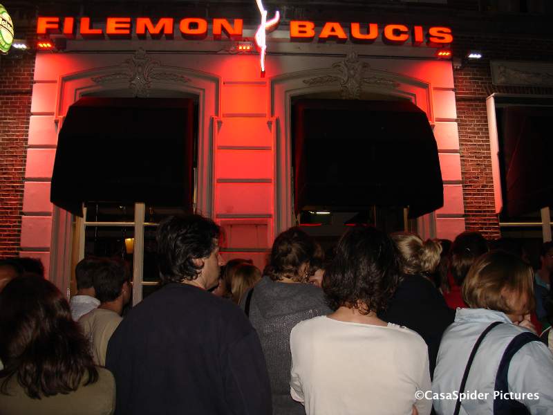 Ronald en Jannie kwamen binnen. Marcel, de broer van Ronald, was er niet bij omdat hij jarig was. Later op de avond ondernamen wij een poging daarbij aanwezig te zijn. De rij wachtenden buiten bij Filemon Baucis aan het Janskerkhof was echter te groot.
