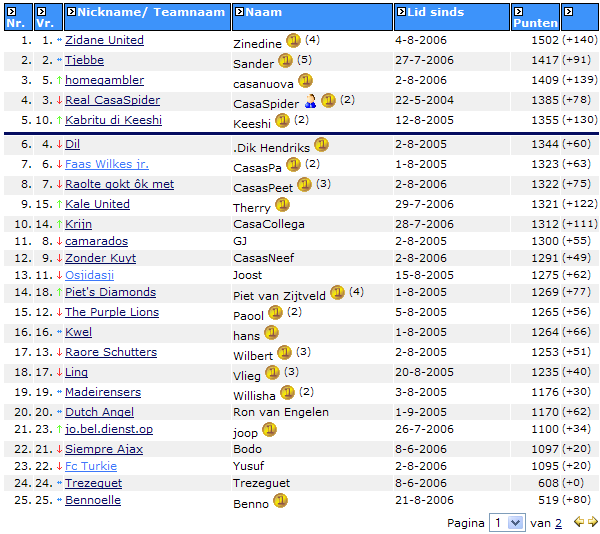 Beste individuele Weblogger is team Zidane United met 1502 punten. De tweede plek is voor Tjebbe, derde is Homegambler, vierde Real CasaSpider en vijfde de plotseling opduikende Kabritu di Keshi. Sommigen weten het niet anderen wel, maar Zidane United is het alter-ego van CasaSpider zelf. In het leven geroepen om echte voorspellingen mee te kunnen doen, immers Real CasaSpider moet Feyenoord bijna altijd laten verliezen. Hoewel dat dit jaar niet eens zo slecht uitkwam.