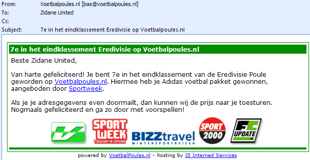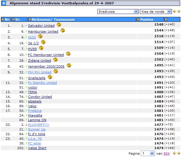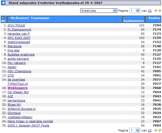 Parallel aan de echte voetbalcompetitie is daar de voetbalpoule. Ook hier zijn beslissingen gevallen al is het (mij) niet helemaal duidelijk of de play-offs nu wel of niet meetellen voor het eindresultaat. De Webloggers hebben het goed gedaan en zijn uiteindelijk op een zeer verdienstelijke 16e plaats geëindigd uit 545 teams. Niet slecht en volgend seizoen nog beter!