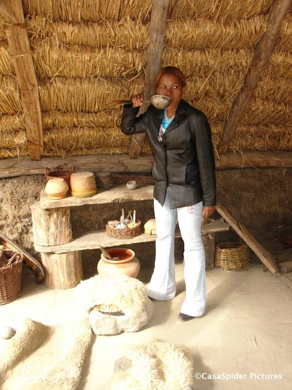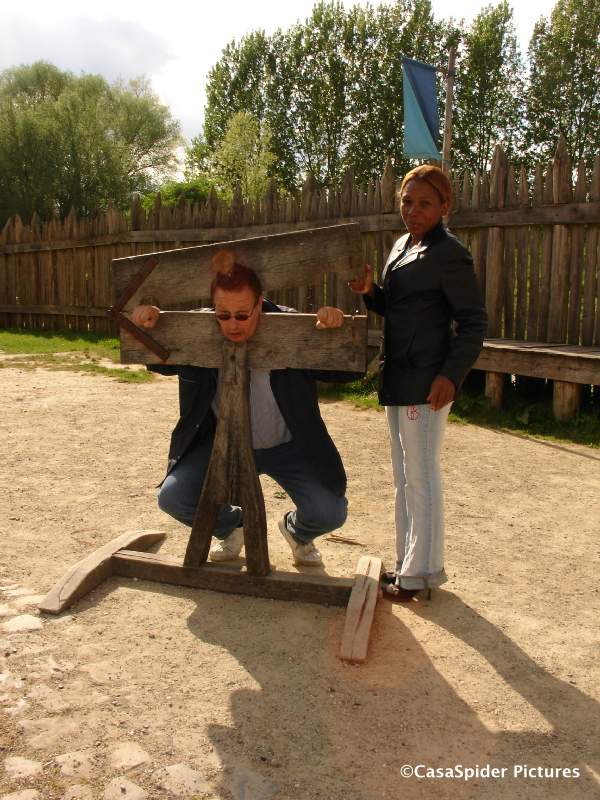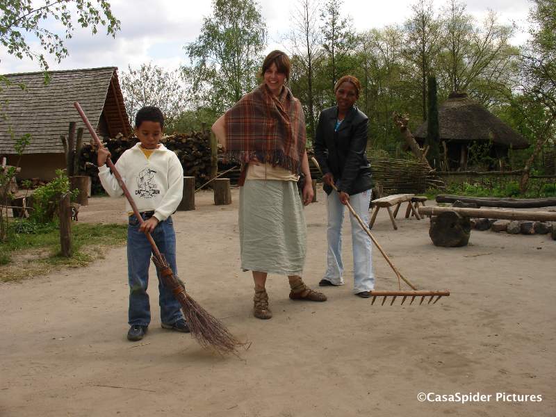 Uit een van de gebouwtjes haalde ze een hark en een bezem. We trokken de prehistorische vrouw aan haar haren uit een hol en dat vond zij kennelijk wel grappig. Bijna alles is van hout gemaakt, zo ook dit prieeltje.