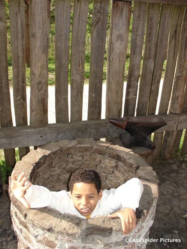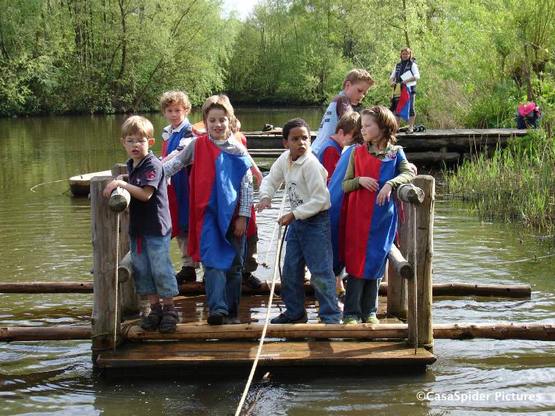 In het Openluchtmuseum zijn niet alleen dingen te bezichtigen, vooral kinderen kunnen er ook dingen doen. Aan een touw met een vlot van de ene naar de andere kant varen leek Luchiano (9) wel wat. Ja, tot het moment dat de middeleeuwse kinderen met het vlot begonnen te schommelen. Dat leverde natte schoenen en een natte spijkerbroek op. Hier kijkt Luch al enigszins gepikeerd.
