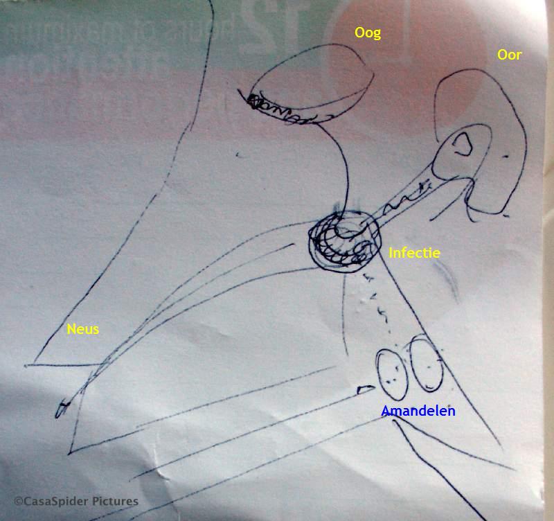 De diagnose van dokter Faries luidt dat zich een infectie ergens achter de neus bevindt. Helaas is het niet mogelijk om deze infectie te zien, maar deze kan via kanalen zowel de oren, de ogen als de keel en de longen (slijm) bereiken. Met een paar lijnen schetste zij de situatie op papier. Nu ben ik werkelijk ontzettend slecht in het lezen van dit soort schetsen, dat begint al met het bepalen wat de bovenkant van het papier is.