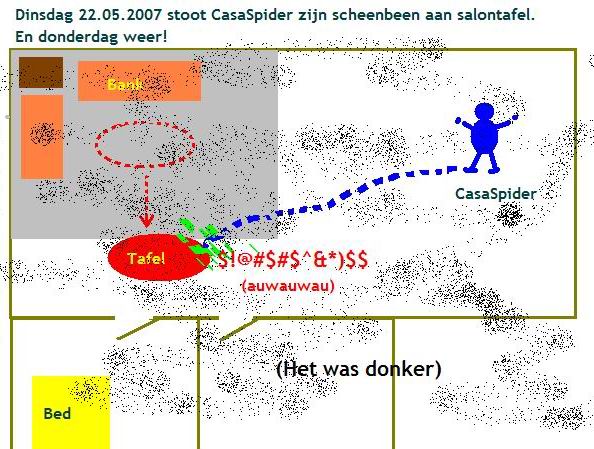 Dinsdagavond ging ik als laatste naar bed. Alle lichten waren uit en ik liep de gebruikelijke route naar de slaapkamer. Mijn handen tastten in het rond, altijd beducht voor gevaarlijke obstakels. De deur van de slaapkamer was bijna bereikt toen #$%%^$#%##%#!!! een helse pijn door mijn rechter scheenbeen schoot samen met een enorm lawaai van een schuivende salontafel en gevolgd door een serie forse vloeken.