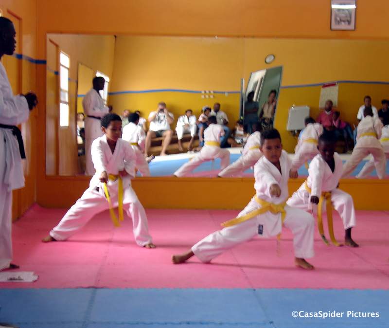Naast Ivonne en Anthony waren twee extra gecommitteerden aanwezig bij het examen dat traditioneel begon met een conditietest. Sit-ups (2x30), push-ups (30), heen en weer springen (1 minuut en 15 seconden), doorzakken met gestrekte armen (2x25), het kwam allemaal aan de orde. Hierna werd afwisselend de groep kandidaten voor de gele en de oranje band opgeroepen om basistechnieken (kihon) en combinatietechnieken (renraku waza) te tonen.