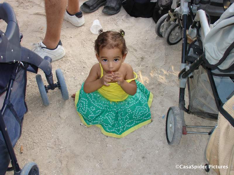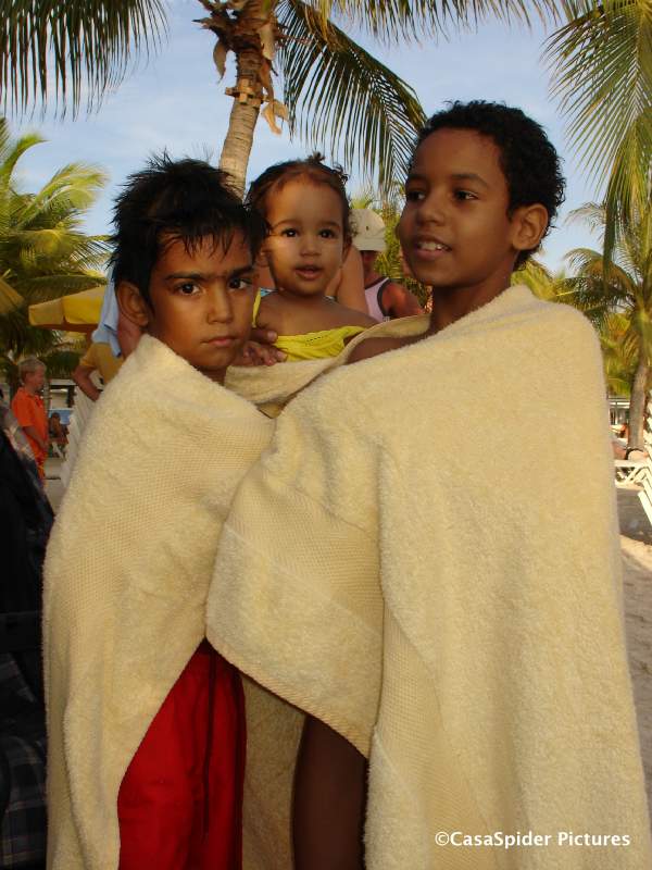 Een eerste foto van Diana (1) temidden van Arwin (4) en Luchiano (9) gehuld in een gele handdoek op Wet&Wild.