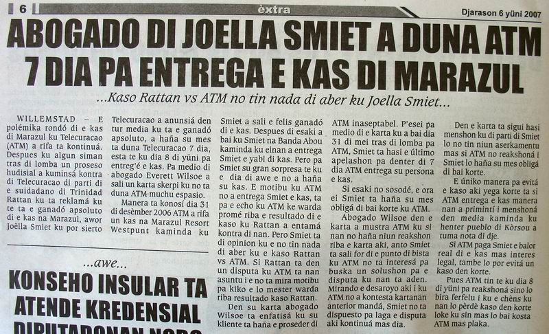 Op 31 mei is ook Joëla Smiet in actie gekomen, zie het Papiamentstalige artikel in de Extra van woensdag. Bij monde van haar advocaat Everett Wilsoe eist zij dat TeleCuracao het betreffende huis dan wel de waarde hiervan in geld vermeerderd met wettelijke rente voor vrijdag 8 juni aan haar overdraagt. Indien dit niet gebeurt stapt ook zij naar de rechter. Advocaat Wilsoe stelt dat Joëla Smiet de winnares is van de eindejaarsloterij en derhalve niets van doen heeft met het dispuut tussen TeleCuracao en Ugrasen Rattan.