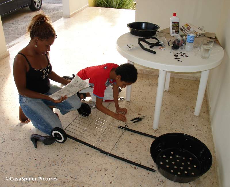 Terwijl ik de gebruiksaanwijzing probeerde te ontcijferen begon zij met het inelkaar zetten van het apparaat. En zowaar, na een half uur leek het ding sprekend op het demo-model bij Goisco. Zelfs de wielen deden het. Terwijl Diana (1) met haar fietsje liep legden wij een laag kolen op de bodem, goten er aanmaakplie overheen en staken de zaak in de hens.