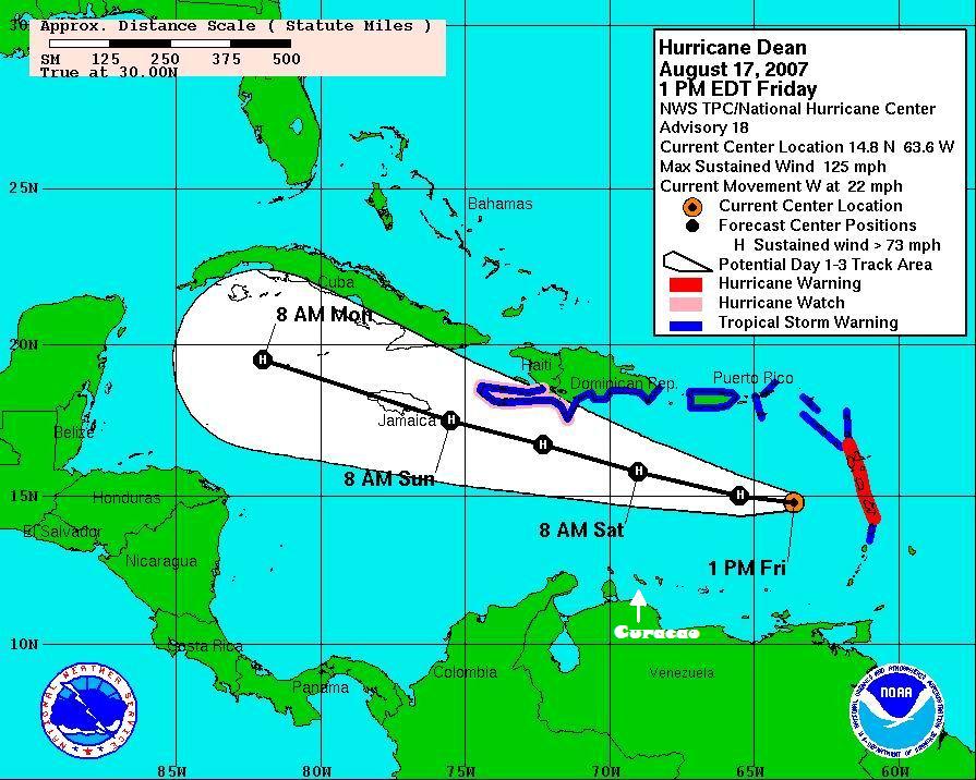 Ik heb het al eerder gezegd, typisch een geval waarvan we over een jaar of 20 pas weten wat de waarheid was. Van Hurricane Dean weten we dat waarschijnlijk zondag al. Het feit dat de tekst Curacao in Venezuela is geplaatst berust op louter toeval.