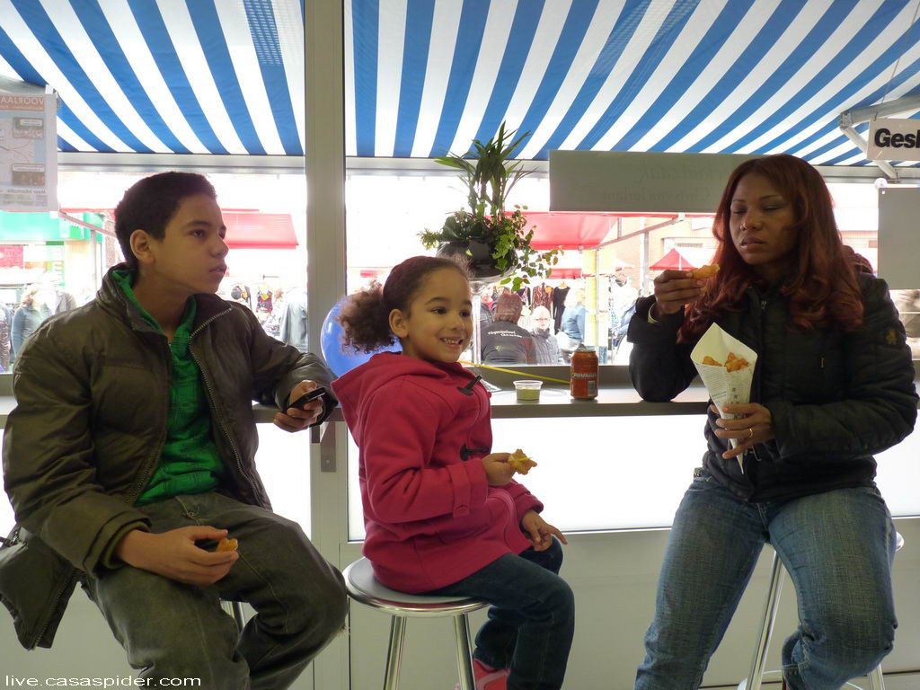 Het is tijd om afscheid te nemen. We zijn blij dat CasasPa er relatief goed bij ligt en dat we hem even gezien hebben. Mijn zus Margriet woont in Portugal en heeft alleen telefonisch contact, dat is een van de moeilijke dingen als men emigreert. Beneden zit Diana bij Luchiano op schoot en ze doen een spelletje op de iPod Touch. Het bord patat is leeg.