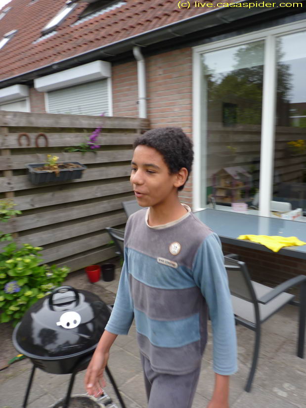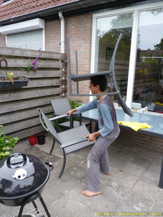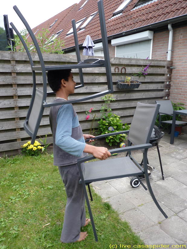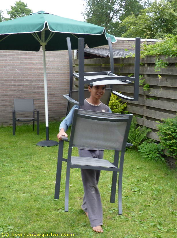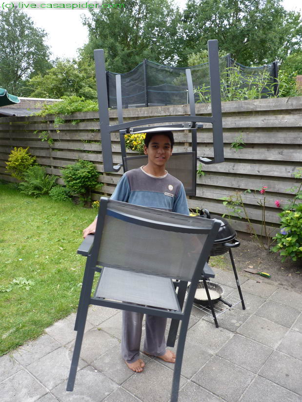 Na een gezellige BBQ moet er opgeruimd worden. Luchiano (013) denkt het sneller te kunnen door de drie stoelen in één keer te dragen. Hij heeft er in ieder geval lol in. 12.06.2011: Luchiano (013) denkt de klus met de drie stoelen sneller te klaren door het in één keer te doen. Klik voor groter.