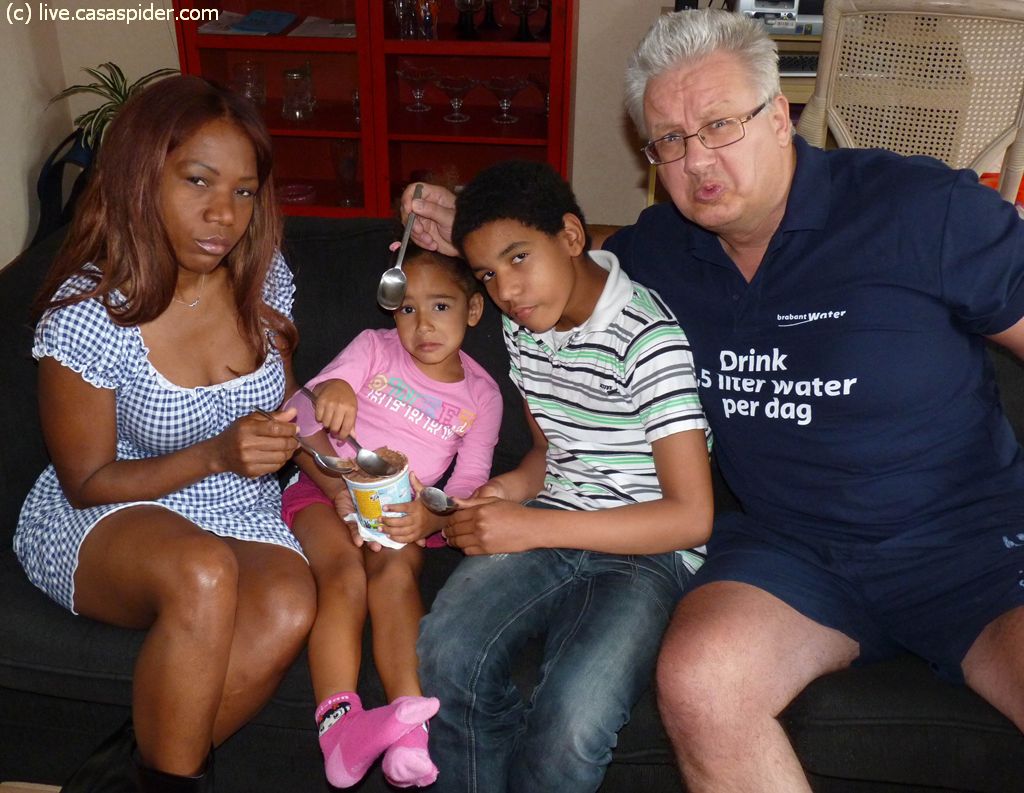 Typisch de Postcodeloterij. Dan win je eens wat en heb je nog geen vrije keuze, het is gewoon schandalig. Uiteindelijk komt hij aanzetten met een minuscuul bekertje met iets van chocolade-ijs. Het voordeel is dat dit bekertje zonder problemen in onze koelkast past. We moeten er een beetje om lachen en besluiten er een foto-reportage van te maken.