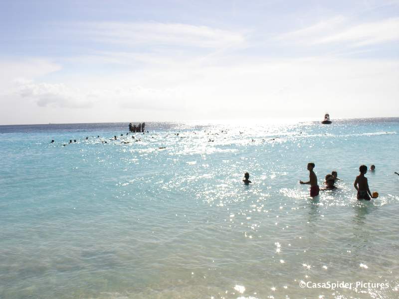 We waren precies op tijd voor de start van het zeezwemmen om vier uur 's middags. Gelukkig stond er deze keer nauwelijks wind. Golven slopen de krachten van met name de minder geoefende zwemmer. Tot veler verrassing kwamen twee jeugdige Antillianen als eerste uit het water tevoorschijn.